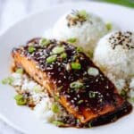 - Step 7: Brush the salmon with the reserved sauce, garnish with green onions and sesame seeds, and serve immediately with rice.