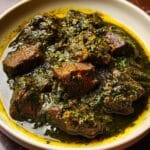 A rich and flavorful Lebanese Beef Molokhia Stew featuring tender beef chunks simmered with aromatic spices and molokhia leaves, finished with a garlic butter infusion and a touch of lemon. Served traditionally with Lebanese-style rice and toasted pita bread for a comforting and authentic Middle Eastern meal.