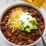 - Serve: Ladle the chili into bowls and garnish with optional toppings like shredded cheddar cheese, Fritos, and chopped green onions. Enjoy warm!