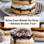 Boston Cream Whoopie Pies combine the classic flavors of a Boston cream donut into a fun, handheld treat. Soft, tender cake rounds sandwich a creamy vanilla filling and are topped with a rich chocolate ganache. Perfect for parties or an indulgent snack.