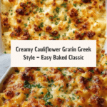 This Greek Grandmother’s Creamy Cauliflower Gratin is a comforting, baked classic featuring tender blanched cauliflower florets topped with a luscious béchamel sauce blended with Kefalotyri cheese, all finished with a golden, cheesy breadcrumb crust. Perfect as a savory side dish or a satisfying vegetarian main, it beautifully marries creamy texture with a crisp topping.
