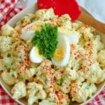 - Garnish and serve: Before serving, sprinkle the salad with paprika for color and garnish it with the remaining sliced hard boiled eggs and a sprig of fresh parsley for an attractive presentation. Enjoy your delicious cauliflower potato salad!