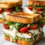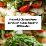 This Chicken Pesto Sandwich recipe combines tender, juicy chicken cutlets with vibrant basil pesto, fresh mozzarella, ripe Roma tomatoes, and peppery arugula, all nestled inside toasted ciabatta rolls. Ready in just 30 minutes, it’s a flavorful and satisfying meal perfect for lunch or a quick dinner.