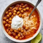 This Chickpea Tomato-Rice Soup is a comforting and flavorful dish featuring crispy spiced chickpeas, a rich tomato and chipotle-infused broth, and tender jasmine rice. The soup is made by roasting seasoned chickpeas until crispy, blending fresh tomatoes with garlic and onion for a silky base, then simmering everything together with rice and smoky chipotle peppers. It’s perfect served with creamy Greek yogurt and a squeeze of lime for brightness, offering a satisfying mix of textures and smoky-spicy flavors.