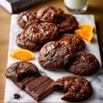 These Chocolate Orange Brownie Cookies combine the fudgy richness of brownies with the chewy texture of cookies, enhanced by a bright citrus twist from orange zest and chunks of orange-infused chocolate. Perfectly baked to have dark, shiny tops with melt-in-your-mouth centers, they offer a delightful balance of chocolate and zesty orange flavors.