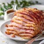This Coca Cola Ham recipe features a juicy bone-in ham glazed with a sweet and tangy bourbon-coca cola glaze. The ham is scored and slow-baked in the oven, then finished with a reduced bourbon glaze made from the pan juices for an irresistible savory-sweet flavor, perfect for any holiday or special occasion.