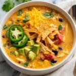 - Adjust Seasonings and Serve: Taste the soup and add additional taco seasoning, hot sauce, salt, or other seasonings as preferred. Ladle into bowls and garnish with your choice of diced avocado, sour cream, jalapenos, shredded cheese, cilantro, and crispy tortilla strips.