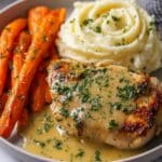 This creamy herb chicken recipe features tender seared chicken breasts smothered in a rich garlic-parmesan cream sauce, paired perfectly with buttery mashed potatoes and sweet glazed carrots. A comforting, balanced meal ideal for weeknight dinners or special occasions.