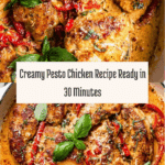 Keywords: creamy pesto chicken, pesto chicken recipe, creamy chicken skillet, easy Italian chicken, chicken with sun-dried tomatoes, bell pepper chicken, one-pan chicken dinner