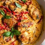 Keywords: creamy pesto chicken, pesto chicken recipe, creamy chicken skillet, easy Italian chicken, chicken with sun-dried tomatoes, bell pepper chicken, one-pan chicken dinner