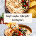 This creamy taco dip is a simple and flavorful appetizer perfect for parties or casual gatherings. Combining tangy sour cream, spicy taco seasoning, and fresh garnishes, it’s sure to be a crowd-pleaser.