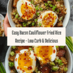 Easy Bacon Cauliflower Fried Rice is a quick and flavorful low-carb alternative to traditional fried rice. Using frozen cauliflower rice makes this recipe both convenient and healthy, while crispy bacon, sesame oil, garlic, and a touch of chili paste add bold flavors. Soft boiled eggs added at the end create a rich, creamy finish, perfect for a satisfying meal.