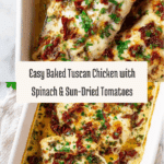 Keywords: Tuscan chicken, baked chicken, creamy chicken, spinach chicken, sun-dried tomato chicken, Italian chicken recipe, easy chicken dinner