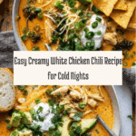 This easy creamy white chicken chili is a comforting bowl perfect for chilly fall and winter evenings. Made with poblano peppers, jalapeños, shredded chicken, and a touch of cream cheese, it’s both spicy and creamy. Top it off with cheddar cheese, fresh cilantro, and avocado for a deliciously satisfying meal.