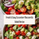 Keywords: cucumber mozzarella salad, easy salad recipe, fresh basil salad, avocado salad, cherry tomato salad, no-cook salad, Italian salad