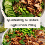 Keywords: crispy rice salad, high protein salad, chicken salad recipe, asian inspired salad, healthy dinner, easy lunch, cilantro lime dressing