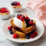 - Serve: Arrange French toast on plates and garnish with your choice of maple syrup, butter, fresh berries, whipped cream, Greek yogurt, or a sprinkle of powdered sugar. Enjoy warm.