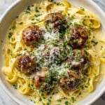 These Garlic Butter Meatballs with Creamy Linguine are a comforting and flavorful meal perfect for any night of the week. Juicy meatballs are simmered in a rich garlic butter cream sauce and served over tender linguine for a satisfying dinner everyone will love.