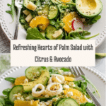 This fresh and vibrant Hearts of Palm Salad combines the tender texture of hearts of palm with juicy orange supremes, crisp cucumber, peppery arugula, and creamy avocado, all lightly dressed in a tangy lemon vinaigrette and topped with grated Parmesan cheese. It’s a refreshing, nutritious salad perfect as a light lunch or an elegant starter.