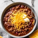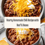 This Homemade Chili recipe is a hearty, flavorful dish perfect for a comforting meal. It combines lean ground beef and pork sausage with a robust blend of tomatoes, beans, and spices, simmered to perfection for a thick, rich chili. Topped with optional cheddar cheese and sour cream, this classic chili is easy to make and satisfying for any occasion.
