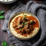 - Finish and serve: Optionally, stir cheese into the sauce at this point until melted to add richness. Spoon the creamy eggplant purée onto plates and top with the lamb stew. Garnish with chopped parsley and serve immediately.