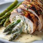Juicy Asparagus Stuffed Grilled Chicken Breast is a restaurant-quality, high-protein, low-carb meal featuring tender chicken breasts stuffed with provolone, fresh basil, and asparagus, then grilled to perfection. Finished with a creamy garlic sauce made from sour cream, garlic powder, Dijon mustard, and dry white wine, this dish is perfect for weeknight dinners or entertaining guests, coming together in under an hour with simple ingredients.
