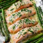- Step 5: Drizzle the garlic butter mixture over both the salmon and asparagus. Season with salt and black pepper to your liking.