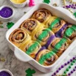 Delight in these King Cake Cinnamon Rolls, a festive twist on classic cinnamon buns featuring a tender dough infused with cinnamon and sugar, baked to golden perfection, and topped with a sweet vanilla glaze. Perfect for celebrations or a special breakfast treat.