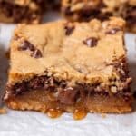 Knock You Naked Bars are a delicious layered cookie bar featuring a buttery chocolate chip base, topped with a rich homemade caramel and peanut butter sauce, and finished with dollops of cookie dough baked to a golden perfection. Perfect as an indulgent dessert or snack.