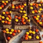 - Add the toppings and set: Sprinkle 1 cup of Reese’s Pieces evenly over the top chocolate layer. Chill in the refrigerator until fully set.