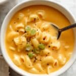 Keywords: mac and cheese soup, cheesy soup, comfort food, creamy soup, easy soup recipe, cheddar soup, pasta soup