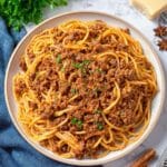 Makaronia Me Kima is a traditional Greek spaghetti dish featuring a rich and aromatic ground beef meat sauce simmered with cinnamon, cloves, bay leaves, and crushed tomatoes. This comforting and flavorful recipe is served with grated Parmesan, making it a hearty meal perfect for any occasion.