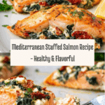Keywords: Mediterranean stuffed salmon, baked salmon, feta stuffed fish, healthy salmon recipe, high protein dinner