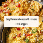 Menemen is a traditional Turkish breakfast dish featuring scrambled eggs cooked with sautéed onions, tomatoes, red bell peppers, and serrano chili, finished with creamy feta cheese. This savory and mildly spicy skillet dish is perfect for a wholesome, flavorful morning meal.