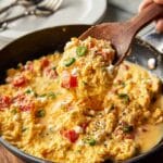 Menemen is a traditional Turkish breakfast dish featuring scrambled eggs cooked with sautéed onions, tomatoes, red bell peppers, and serrano chili, finished with creamy feta cheese. This savory and mildly spicy skillet dish is perfect for a wholesome, flavorful morning meal.
