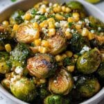 A vibrant twist on classic Mexican street corn, this recipe features crispy roasted Brussels sprouts mixed with charred corn, creamy lime-infused mayo, and topped with crumbly cotija cheese and fresh cilantro. Perfect as a flavorful side dish or a unique snack.