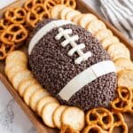 A fun and decadent Oreo Cream Cheese Football Dip that’s perfect for game day or any party. This no-bake dessert dip combines crushed Oreo cookies with creamy, fluffy sweetened cream cheese, molded into a football shape, decorated with mini chocolate chips and piped cream cheese laces for a festive touch.