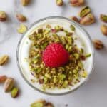 This Pistachio Overnight Oats recipe offers a creamy, nutritious, and easy-to-make breakfast option featuring pistachio butter, chia seeds, and quick oats soaked in non-dairy milk. Topped with non-dairy yogurt, fresh raspberries, and chopped pistachios, it provides a delightful blend of flavors and textures to start your day on a healthy note.