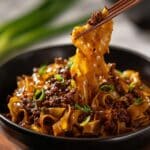 This flavorful Potsticker Noodle Bowl combines tender ground pork, wide lo mein noodles, and a vibrant mix of Asian-inspired sauces. Enhanced with ginger, garlic, and sriracha for a spicy kick, and finished with fresh green onions and crunchy coleslaw mix, this quick and easy stir-fry dish is perfect for a satisfying weeknight meal.