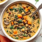 This hearty and comforting Pumpkin Wild Rice Soup combines the earthiness of wild rice and mushrooms with the creamy sweetness of pumpkin purée and coconut milk. Packed with wholesome vegetables, chickpeas, and fresh kale, this soup is perfect for a nourishing fall or winter meal.