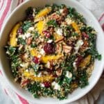 A vibrant and nutritious quinoa salad featuring roasted delicata squash, kale, toasted pecans, dried cranberries, and tangy feta cheese, tossed in a balsamic vinaigrette. Perfect as a wholesome lunch or light dinner, this dish combines warm roasted vegetables with fresh greens and crunchy nuts for a balanced, flavorful meal.