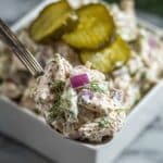 Keywords: chicken salad, dill pickle chicken salad, savory chicken salad, healthy chicken salad, Greek yogurt chicken salad, picnic salad, sandwich filling