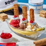Enjoy a nostalgic treat with this playful Scoops Ahoy USS Butterscotch sundae. Combining fluffy waffle cone sails and a colorful banana split, it’s a delightful dessert that’s fun to make and even more fun to eat.