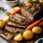 - Slice and serve: Slice the brisket thinly against the grain or shred it using two forks. Serve the meat alongside the cooked vegetables, drizzling the rich cooking liquid over as a savory sauce.
