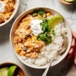 - Serve: Spoon the creamy salsa chicken over cooked rice and add a dollop of sour cream on top to serve.