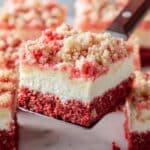 - Top Brownies: Evenly sprinkle the strawberry shortcake crumble over the cream cheese frosting layer. Gently press down the crumble into the frosting to adhere.