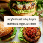 These Stuffed Southwest Turkey Burgers feature a flavorful blend of lean ground turkey mixed with diced pepper jack cheese and green chiles, seasoned with cumin and garlic powder, and grilled to perfection. Served with a zesty, fresh avocado mash made with lemon and lime juice and optional spices, these burgers deliver a melty, juicy experience with a spicy southwest twist ideal for a summer cookout or any casual meal.