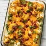 Keywords: jalapeno popper, cauliflower casserole, cheesy casserole, roasted cauliflower, low carb, bacon, spicy, cheese bake