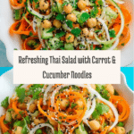 A refreshing and vibrant Thai salad featuring spiralized carrot and cucumber noodles tossed with chickpeas, bell pepper, onion, and fresh herbs, all dressed in a tangy lemon and vinegar dressing with a hint of honey and garlic. This healthy, no-cook salad is perfect for a light lunch or side dish, packed with flavor and crunchy textures.