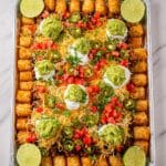 - Add Toppings and Serve: Remove from the oven and immediately top with diced tomatoes, sliced jalapeños, sour cream, guacamole, sliced green onions, and cilantro. Serve the totchos with lime wedges for a fresh, tangy finish.